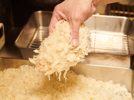 粗めのパン粉は糖分と塩分を少なめにした特注品。「パン粉は糖分が多いと黒くなりやすいです。ポンチ軒はじっくりと火を入れていくので糖分は少なめです。塩分も少ないほうが肉の味がストレートに出ます。パン粉の糖分と塩分が1%違うだけで全然仕上がりが変わってしまいます。